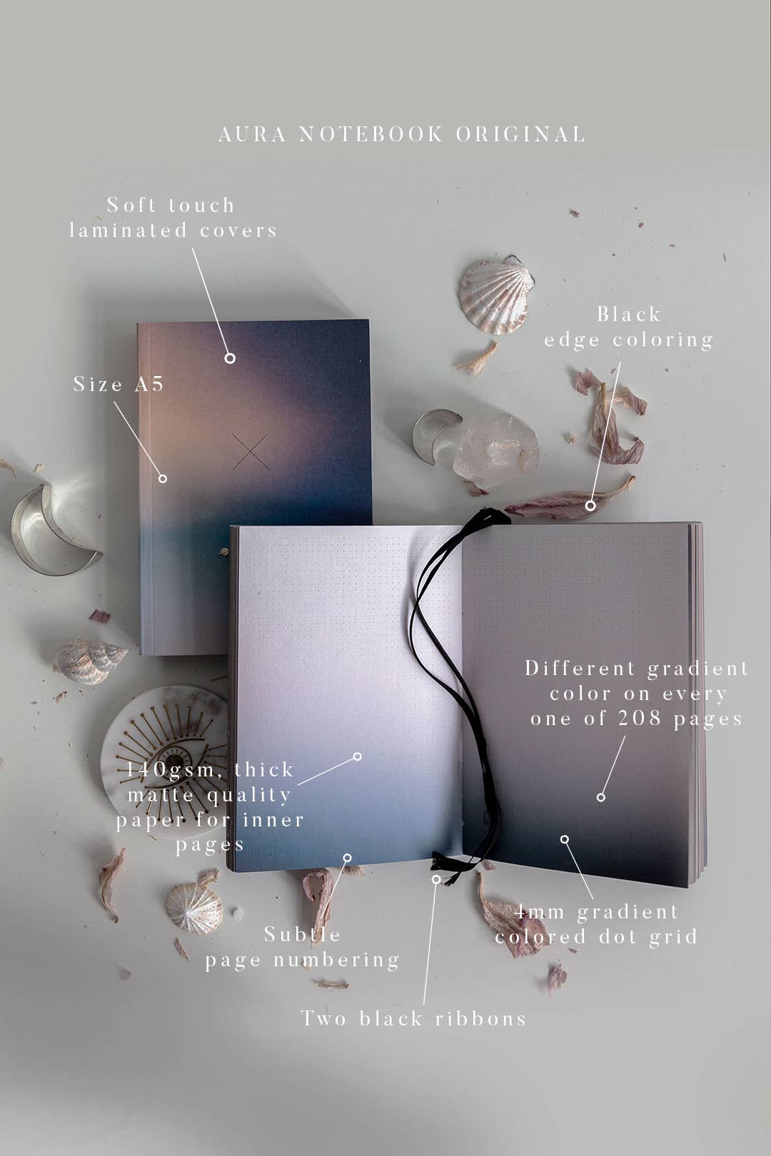 Porta il tuo diario al livello successivo con pagine colorate a gradiente e griglia a punti colorata. L'Aura Notebook Original è dove tutto è iniziato. Con le sue pagine a gradiente distintive e la griglia a punti a gradiente, questo taccuino è la perfetta combinazione di bellezza e funzionalità. Che tu stia prendendo appunti, facendo brainstorming o scrivendo un diario, le pagine spesse e il design unico lo rendono un piacere da usare. Ogni singola pagina ha il suo colore a gradiente unico e le pagine di alta qualità da 140gsm sono perfette per diversi mezzi, da tutte le penne e acquerelli all'inchiostro e oltre. Bullet Journal e Libro di Ispirazione nello stesso copertina dimensione A5 (148mm x 210mm x 19,5mm) griglia a punti colorata a gradiente di 4mm 208 pagine con griglia a punti colorata di 4mm e gradienti mozzafiato carta non patinata di alta qualità da 140g nelle pagine interne numerazione discreta su ogni pagina 2 nastri segnalibro neri copertine laminate soft-touch