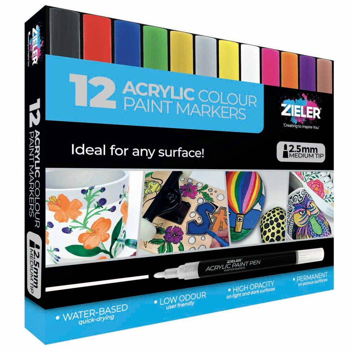 Pennarelli a vernice acrilica, punta media (2,5 mm), set di 12 colori assortiti, di Zieler, 09299290, 12 pennarelli acrilici per pittura su roccia, ceramica, porcellana, vetro, pietra, ciottoli, tessuto, legno e tazze fai da te, di Zieler®. Pennarelli permanenti a base d'acqua - Colori vivaci (punta tonda media - 2,5 mm)